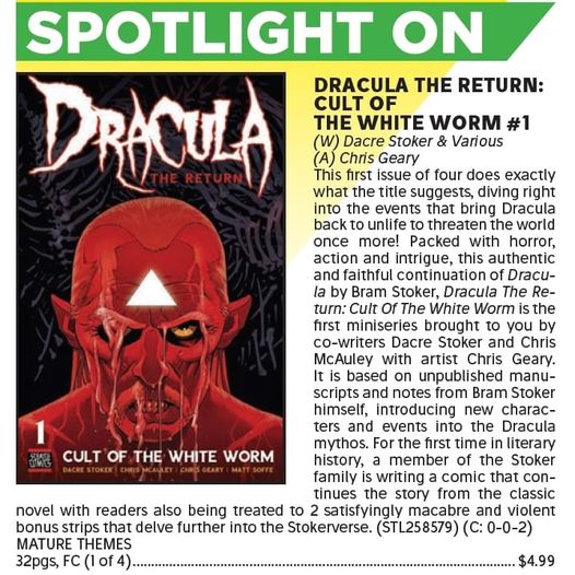 For the first time in literary history, a member of the Stoker family is writing a comic script that officially continues the story of Dracula from the classic novel. Cult Of The White Worm is the first mini series in the official continuation of the classic novel DRACULA by Bram Stoker, brought to you authentically by co-writers Dacre Stoker and Chris McAuley. Contained in a 32-page comic book the story kicks off right at the end of the novel, and utilising Bram Stoker’s own notes, the iconic count is brought back to life in an authentic and faithful, yet fresh and exciting new way. The first 21-pages are a full colour chapter of Cult Of The White Worm with stunning art by Chris Geary and Matt Soffe. We also reveal the mysterious 4th Bride and delve into the backstory of Dracula’s man servant Renfield in two 5 page back up comic strips, one of which is co written by Buffy The Vampire Slayer writer Denise Ciencin with art by the Eagle award winning David Hitchcock.